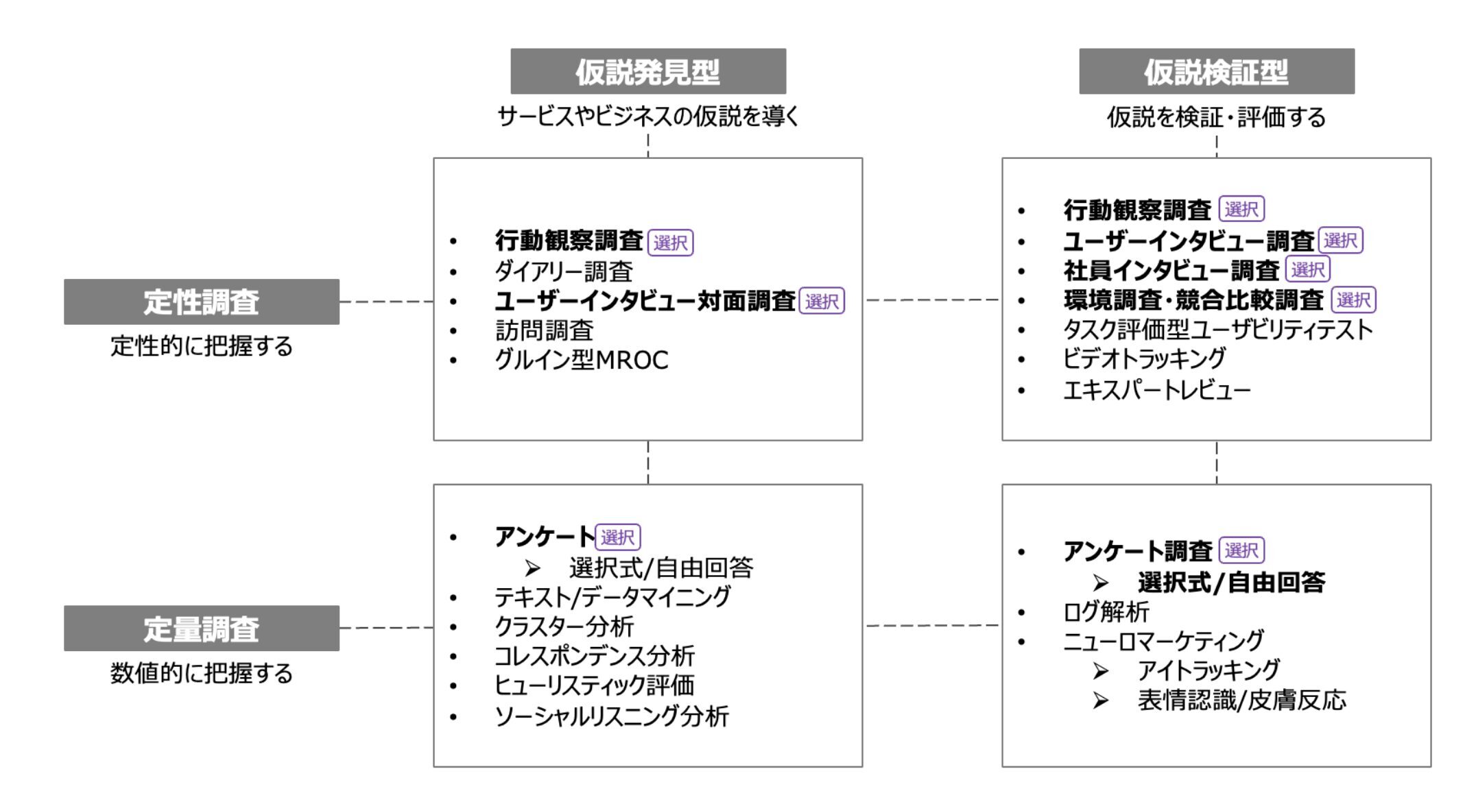 次に、初期仮説を検証するための調査を計画・実行。初期仮説の検証を目的とした仮説検証型の調査を中心に置きながら、仮説発見型の調査も一部採用。より調査精度を高めるために定量と定性を組み合わせることとし、特に定性調査では通常のユーザーインタビューに加えて、行動観察、社員インタビューを実施し、多方面からの視点で仮説検証を実施した。