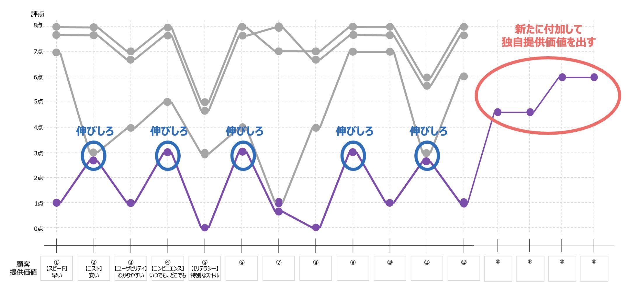 競合ベンチマーク比較の評価には「戦略キャンバス」というフレームワークを活用した。これは競合が注力していない要因に取り組むことで差別化を目指し、ブルーオーシャン(競争のない市場)の開拓を目的として活用される思考ツールの一つだ。顧客提供価値である「スピード」「コスト」「ユーザビリティ」「リテラシー」など12の観点を用意し、利用者の視点で出張/帰省/旅行それぞれの利用シーンを想定して評点を付与。競合他社のサービスにも同様の評価を行い、業界標準と比較して「伸びしろ」はどこなのか、独自価値を提供可能にする「新たに付加すべきもの」は何なのかを明らかにして解決策を策定していった。