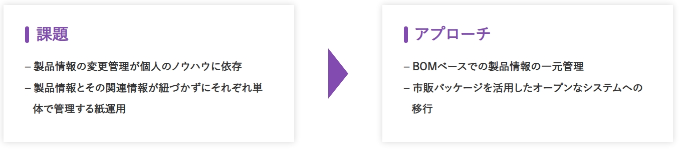 製品仕様に関連する情報を紙からデータ化して製品構成表(≒BOM)と紐づけて管理することを提案。副資材など、製品を製造・出荷するために必要な情報まで含めて構造化し、さらに製造現場で必要な作業指示書等の関連ドキュメントも紐づけてすべてマスタ化を進めた。これにより、製品の変更影響がシステム上で一元的に確認でき、影響把握と情報管理・情報連携が容易となった。