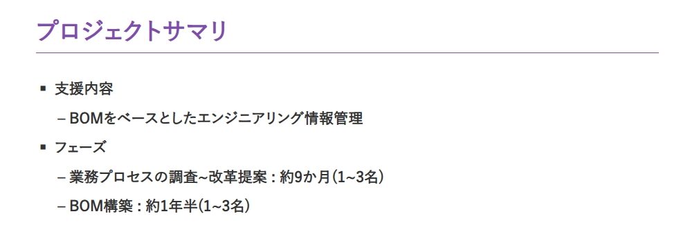 製品情報管理基盤構築の豊富な経験を有するコンサルタントがリード。多くの業種での経験をもとに問題点を速やかに洗い出し、当該企業の運用・ニーズに合わせた仕組みやBOM構造を提案した。