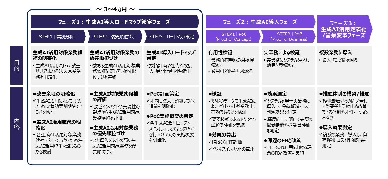 このように、業務の目指す姿と現場の実態の両方を起点として設計することで、短期的な改善と中長期的な業務高度化を両立できる、実行可能性と優先順位が明確な生成AI活用ロードマップを描き、次の検討・実行フェーズへとつなげます。