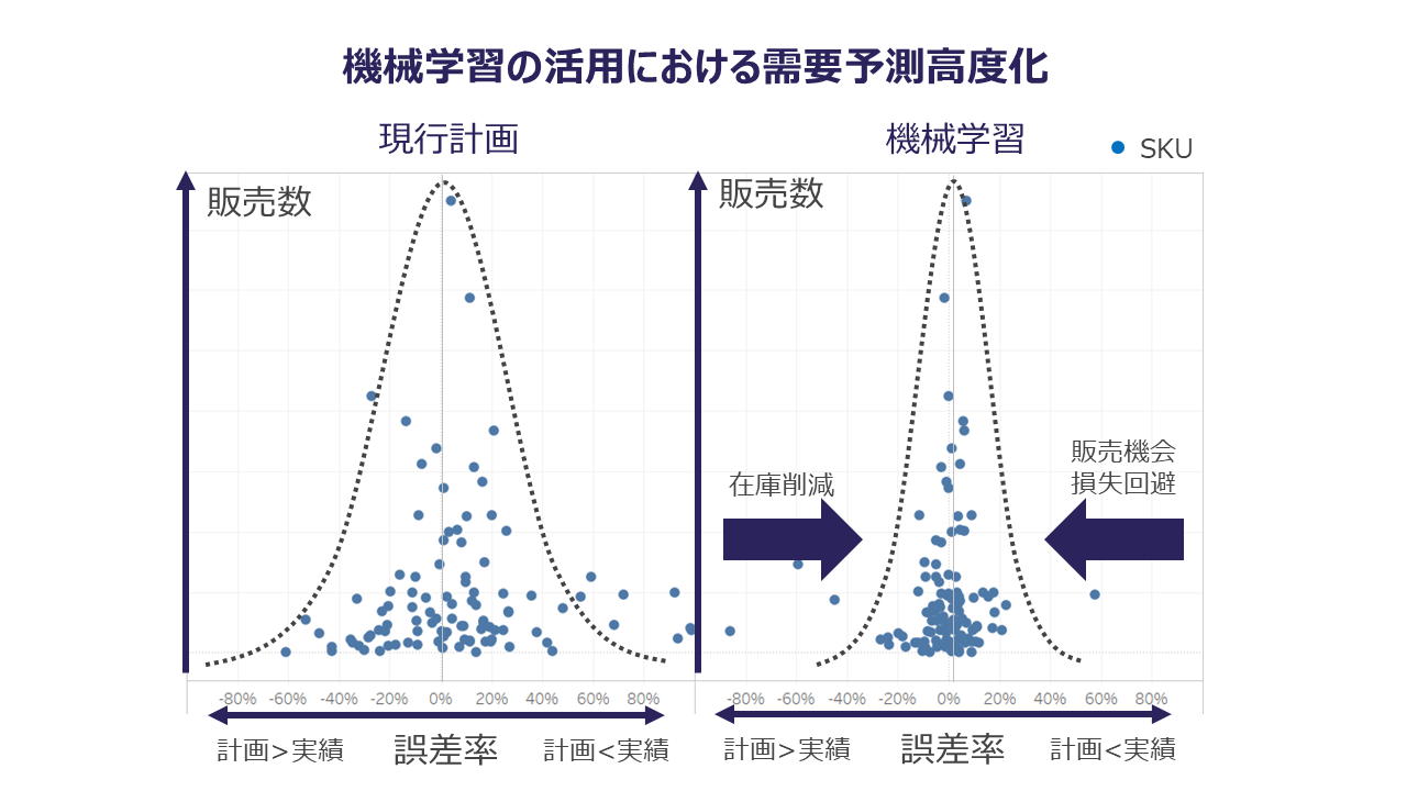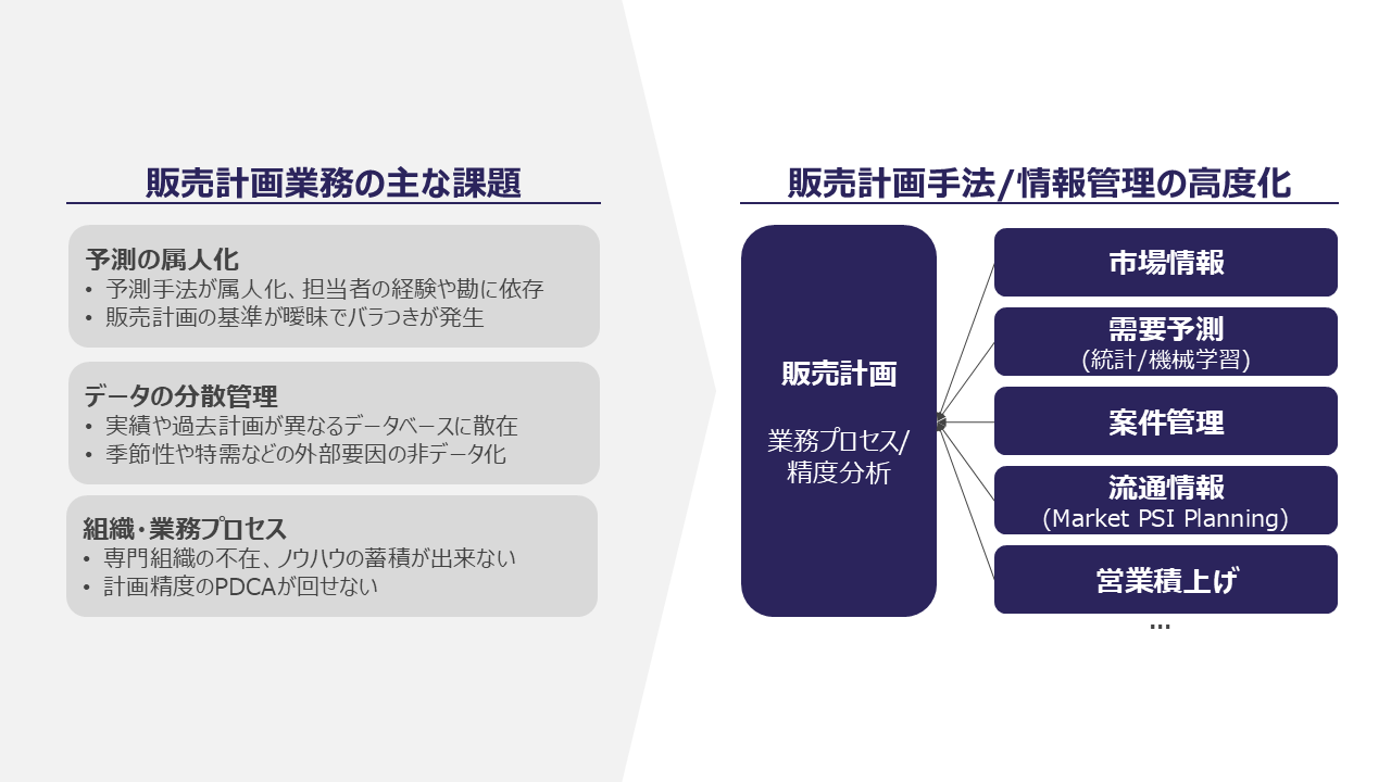 販売計画はサプライチェーン全体計画の起点となる重要な計画でありますが、販売予測の属人化や、計画立案上必要な情報が分散していることによる業務負荷の増加等、計画精度向上や業務効率化に対する数多くの課題があります。それらの解決を目的とした、機械学習を用いた需要予測、流通情報を活用した計画精度向上、販売計画立案プロセスの標準化と管理情報基盤の導入等、様々なアプローチを組み合わせた販売計画の高度化を支援するサービスを提供しています。