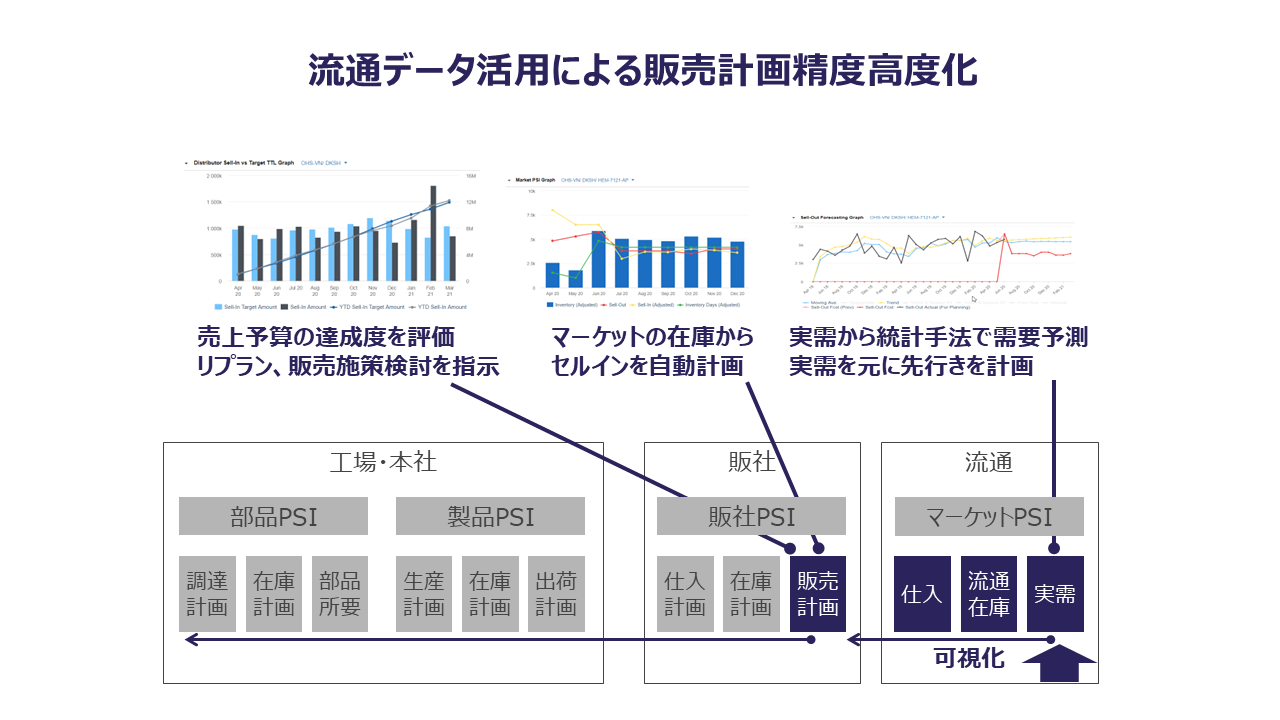 流通データを組み込んだ実需起点のPSI計画により、販売(セルイン)・在庫計画の精度向上を実現します。市場の在庫状況、販売実績を反映したマーケットの需給バランスを可視化し、販売計画から供給の最適化を図ると同時に、データ収集、管理業務の効率化を図りつつ多面的な分析を可能した業務の高度化を実現します。実現に向け、起点となる流通データの入手、部門や企業を跨いだ情報共有等のハードル、導入後も組織変更や商品構成の変化にも柔軟に対応する必要があり、それらを解決する為の支援を企画構想から要件定義、導入、定着化までを一貫してサポートします。