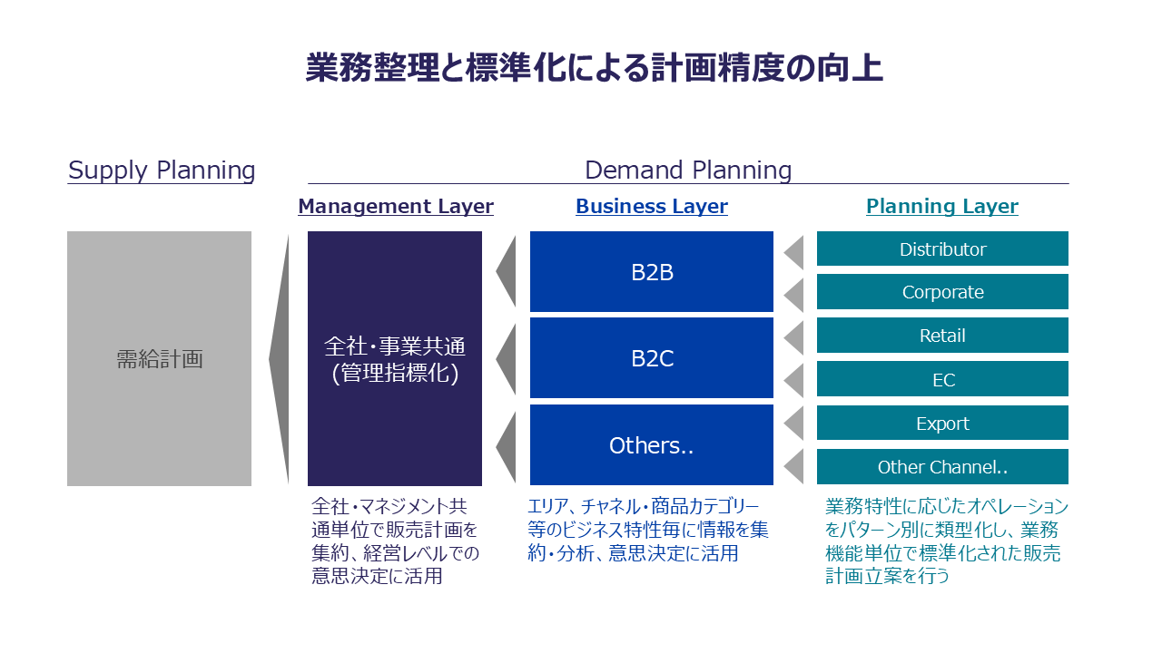 業務・オペレーションを網羅的に整理し、各業務レイヤーをパターン別に類型化することで、計画立案の精度と効率を向上させます。マネジメントレベルの意思決定支援から個々の計画業務までを体系化し、標準化・ルール化を実施することで、業務の一貫性を確保します。さらに、定期レビューやKPIモニタリングを活用し、需要変動への迅速な対応を可能にします。柔軟かつ精度の高い販売計画と、効果的なオペレーションの実現を支援します。