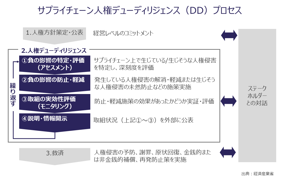「サプライチェーン人権デューデリジェンス(DD)」とは、企業が自社のサプライチェーン上で発生し得る人権への負の影響を特定・防止・軽減するとともに、その取り組みの実効性を評価・説明し、外部に対して適切に情報開示する一連のプロセスを指します。