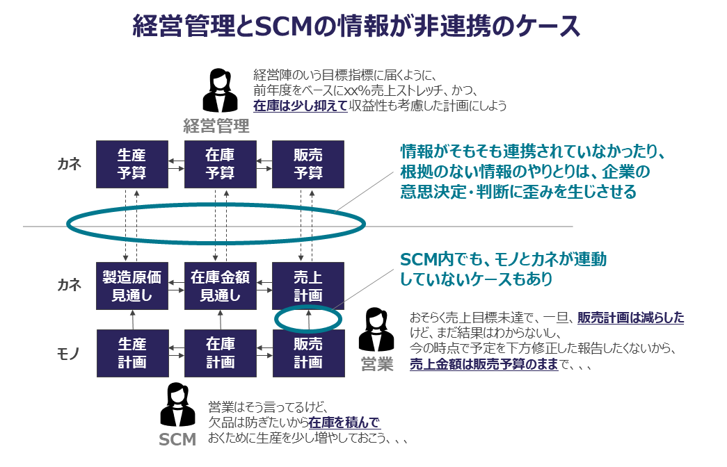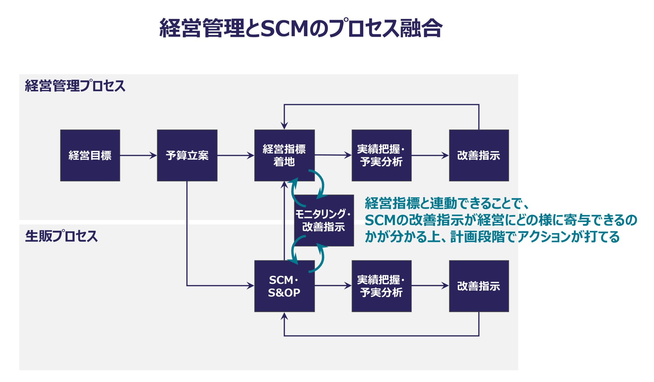 損益見通しの再三の見直しによる株主などのステークスホルダーへの影響、中長期計画シナリオとサプライチェーンの現場の先々のアクション検討の不整合など、経営とSCMの非連動によるリスクを回避し、経営が中長期的な財務数値の妥当性判断をしていくためにも、その根拠となるサプライチェーン活動の見通しを経営管理プロセスに組み込み意思決定をしていくことが必要不可欠です。