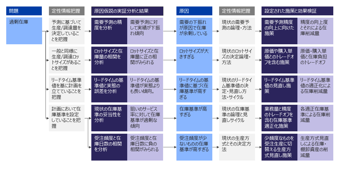 部品・製品における過剰在庫が問題である場合の本サービスの実施例を示します。この例では問題が設定されているため、フェーズ2「原因の特定」以降の本サービスのご支援イメージを掲載しています。