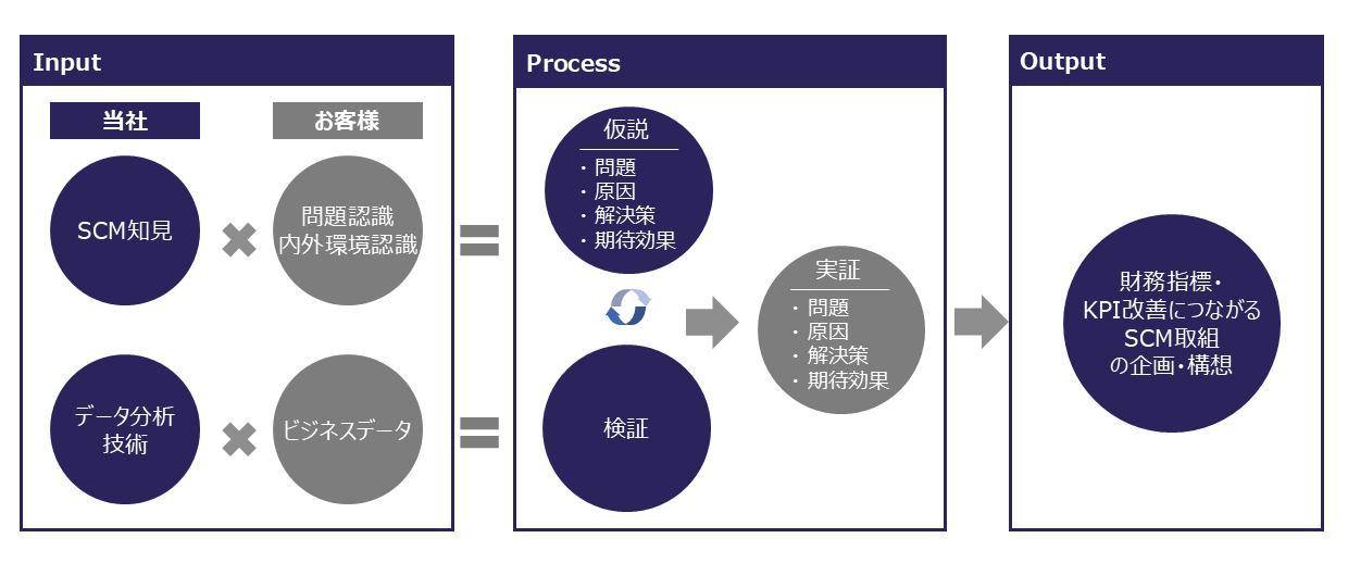 SCMに関する深い知見と高いデータ分析力を備えるフォーティエンスのコンサルタントが、従来のSCM担当者に対するインタビューなどの定性的な業務分析に加えて、受注実績や在庫といったサプライチェーンのビジネスデータを用いた定量的な分析を行うことで、従来よりも裏付けのとれた問題の抽出とその原因の特定、解決策の策定を実施します。さらに、財務指標やSCMの業務KPIに対し期待できる効果を予測、評価・検証することで、より実効性の高い取り組みを可能にします。