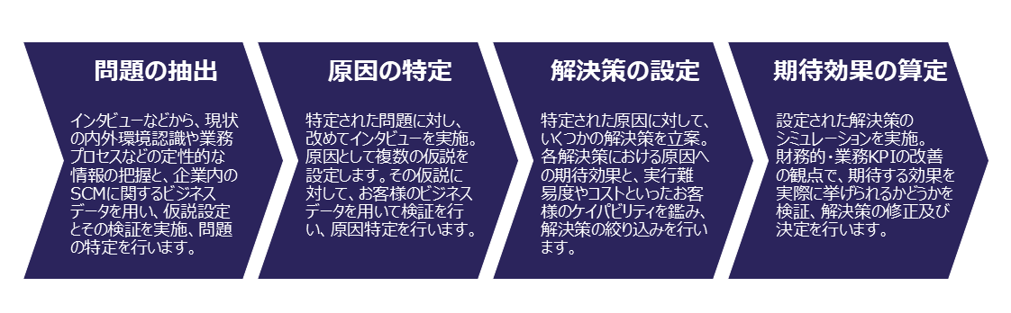 問題の抽出、原因の特定、解決策の設定、期待効果の算定の4フェーズでお客様をご支援することが可能です。