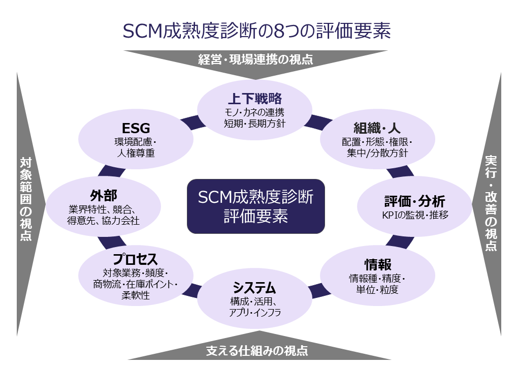 診断表は「上下戦略(モノ・カネの連携)」「組織・人(配置・形態)」「ESG(環境配慮・人権尊重)」など、8つの評価要素で構成されており、企業は自社サプライチェーンの成熟度を包括的に把握できます。