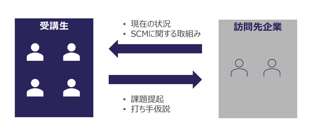 講義パートの後、グループごとに企業訪問を行い、その企業が抱える経営/SCM課題を特定し、解決策の仮説を提示します。訪問先の企業担当者とのディスカッションを通じて、理論だけでは見えにくい現場のリアルな課題や改善の可能性を探ります。受講者はチームで意見を交換しながら、課題設定と仮説立案のプロセスを体験することで、現場感覚を養うと同時に、経営視点を持ったSCM改革の策定力を磨くことができます。