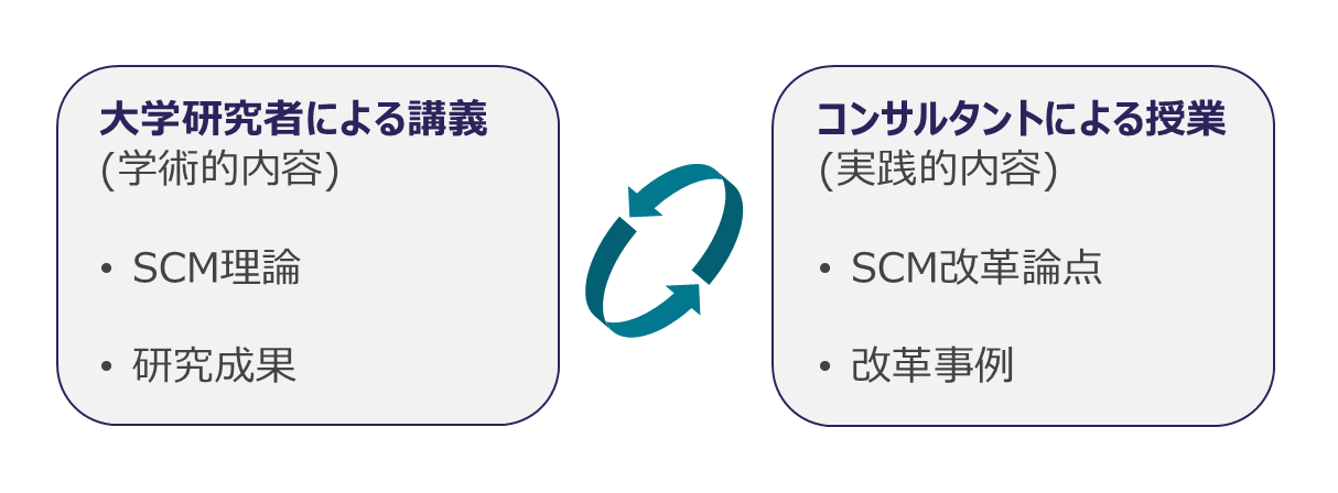 講義パートでは、SCM分野の専門教授による理論的講義と、豊富なプロジェクト経験を持つコンサルタントによる実践的講義を組み合わせた授業を提供します。大学教授の講義では、研究成果やSCMに関する理論を学びます。コンサルタントの講義では、実際の企業事例を挙げながら課題解決の手法を学びます。理論と実践を行き来しながら知識を定着させることで、自社のSCM改革を効果的に推進するスキルを身につけることができます。