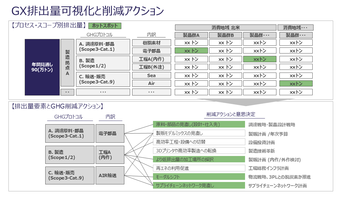 GHGに代表される環境データは、粒度が細かいほど、また、実測値など一次データであるほど、効果の高いホットスポットの特定や打ち手の導出に有効ですが、管理コストとのバランスが肝となります。