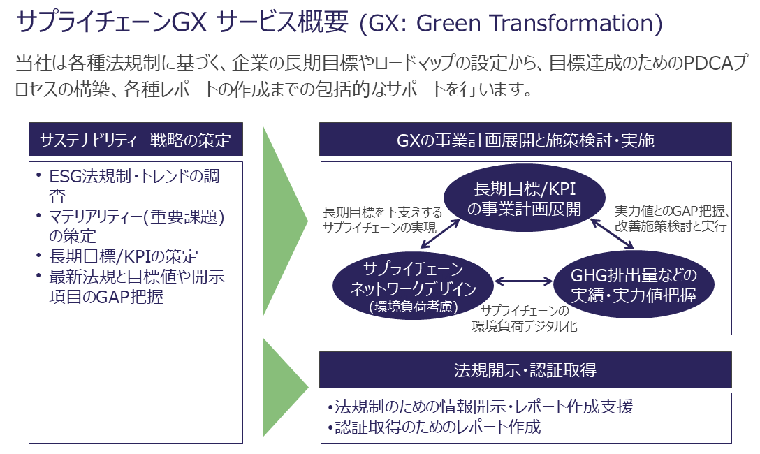 フォーティエンスは、サプライチェーンマネジメントの豊富なコンサルティング実績をもとに、サプライチェーンにおけるGHG排出低減や自然資本の保護の推進に対応する「サプライチェーンGX」のサービスを提供しています。