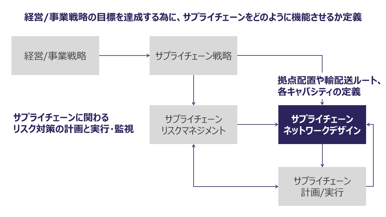 サプライチェーンネットワークデザインは、サプライチェーン戦略に従って、拠点配置や輸配送ルート、在庫配置、条件等の決定を行います。新たなサプライチェーン戦略に適合する為に見直しが必要な場合や、サプライチェーンのパフォーマンス低下に伴う見直しが必要な場合があります。しかしながら、サプライチェーン全体を見渡して分析する機能や組織がない事などから、現サプライチェーンネットワークのパフォーマンス評価や、それら評価に基づくネットワークの見直しについて、十分に検討・実施できているケースは多くありません。