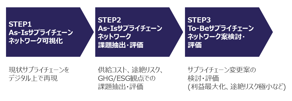 サプライチェーンネットワークの可視化および課題の抽出・評価を行い、サプライチェーンの再設計を支援します。サプライチェーンマネジメントにおけるフォーティエンスの豊富なコンサルティング実績に基づき、供給コスト、途絶リスク、GHG/ESGの4つの観点から課題抽出・評価を行い、サプライチェーンネットワーク全体の最適化を支援します。なお、可視化・分析にあたっては、AIMMS社が提供するデジタルツール「AIMMS Network Designアプリケーション」を活用します。
