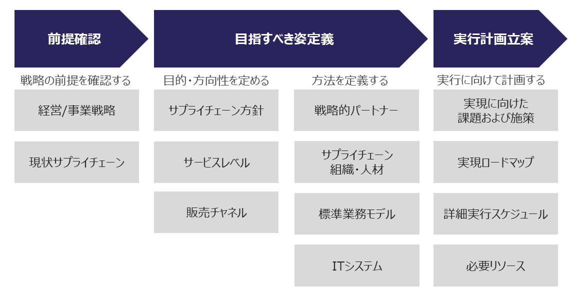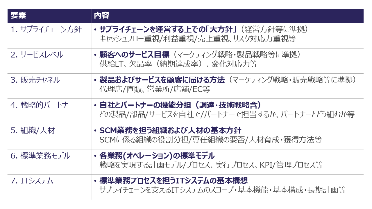 経営ならびに事業戦略をインプットとして、各戦略との整合性を持たせながら、サプライチェーン方針、サービスレベル、販売チャネル、戦略的パートナー、組織/人材、標準業務モデル、ITシステムの7つの要素について具体的に検討し、サプライチェーン戦略を策定します。各社の事業環境や現状の考え方、検討状況によって。総合的に検討した方がよい場合や、いくつかの要素にフォーカスして検討した方が良い場合がありますので、最適な案をご提案致します。