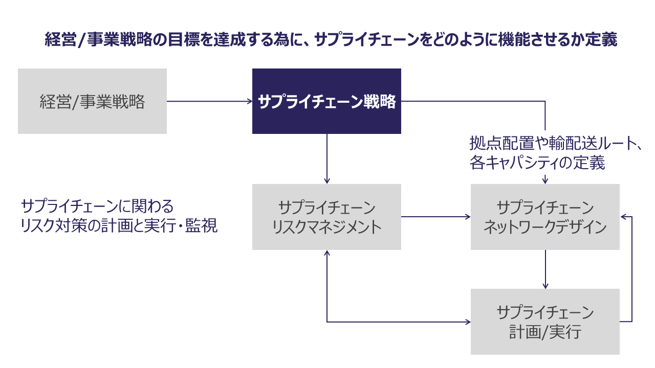 サプライチェーン戦略は、経営ならびに事業の目標を達成するために、サプライチェーンをどのように機能させるかを定義するものとし、自社におけるサプライチェーンマネジメント(SCM)の方向を定める根幹の考え方となります。外部環境をはじめとした事業環境の変化への対応、または自社内部の構造改革に適切に対応するために、これまで前提としていた考え方そのものを見直し、改めてあるべき姿を定義する必要性が高まっています。