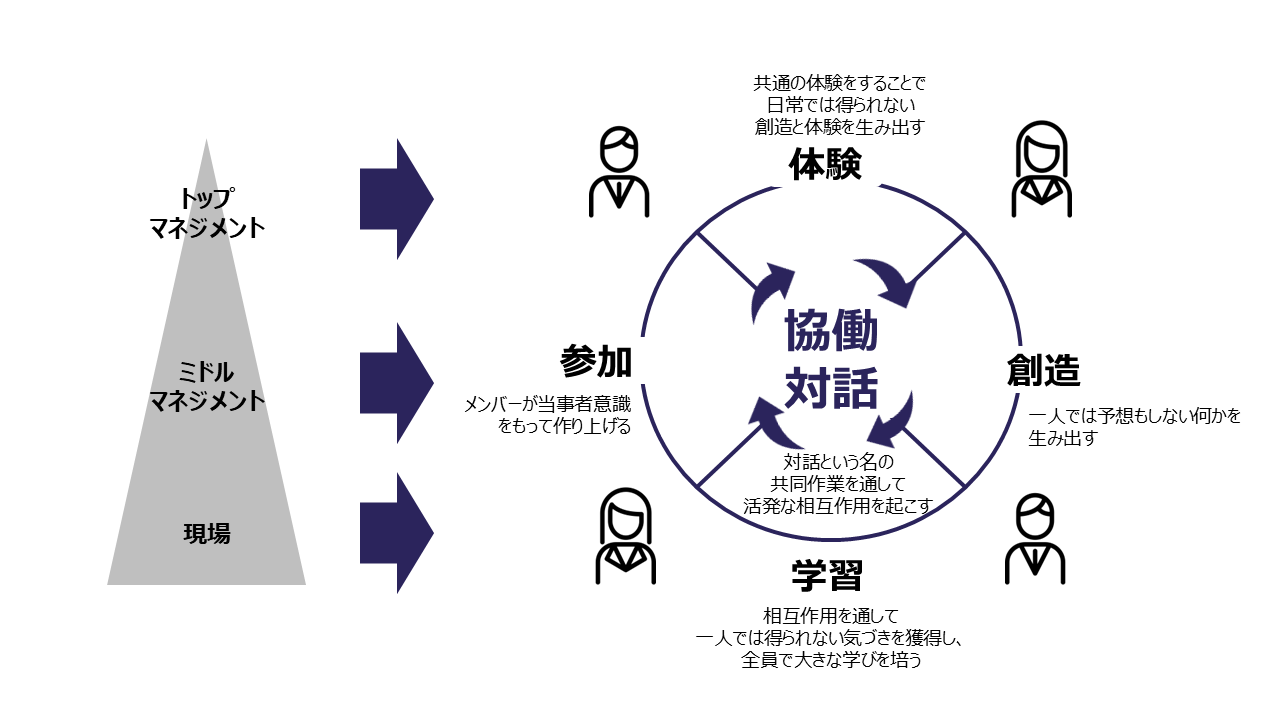 本ワークショップサービスでは、これら両者の特性を踏まえ、それぞれの強みを組み合わせたハイブリッドな設計を行っています。トップマネジメントはあるべき姿や優先課題を明確にすることで、全体の方向性と変革を後押しするコミットメントを行い、現場リーダーは対話と検討を通じて納得感をもって主体的に改革に取り組むことができます。階層を超えた共通理解と協働サイクルによって組織全体としての実行力と推進力を高め、変化に柔軟に対応し続けられる持続的な変革の土台を構築します。