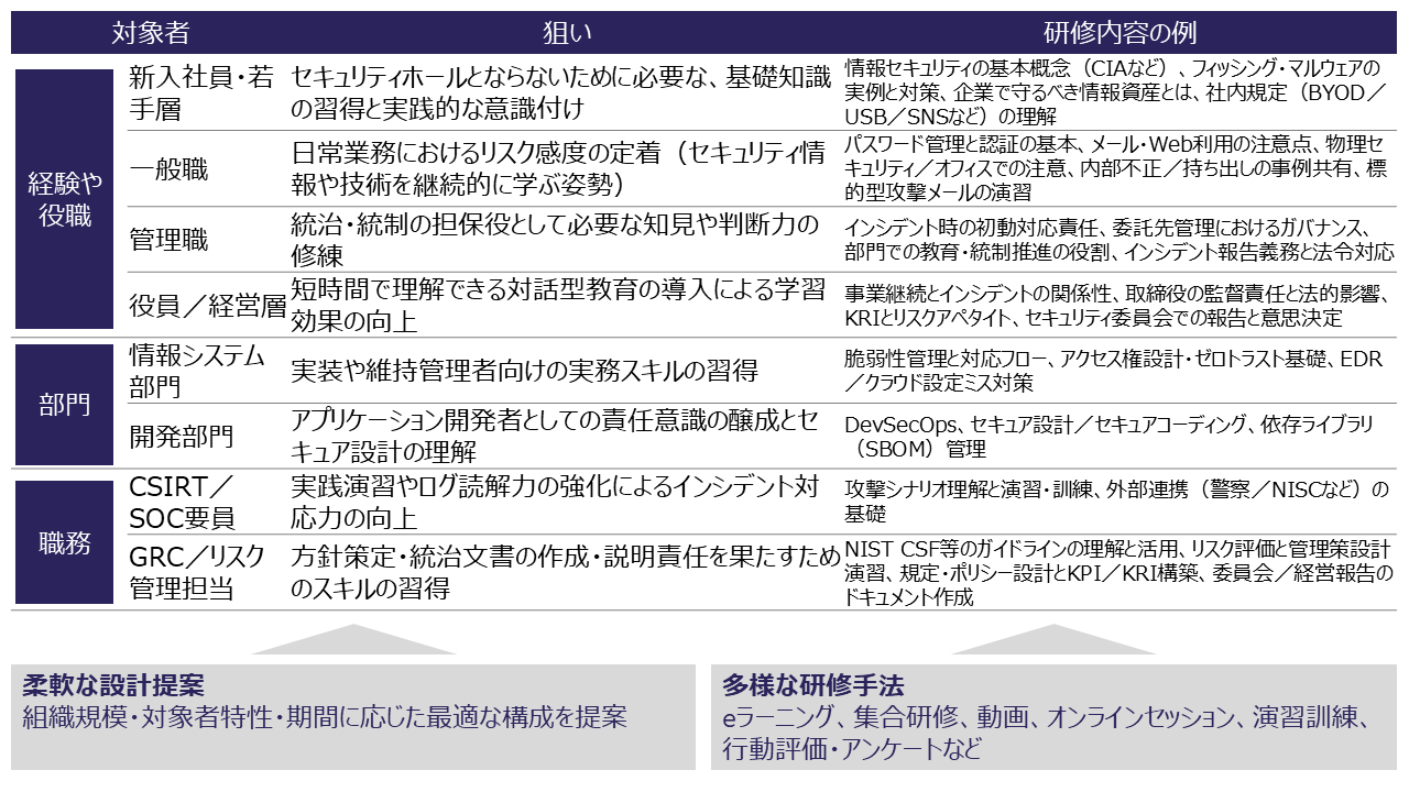 現実的なリスクを踏まえ、対象者の業務や役割に即した教育・訓練を個別に設計。単なる知識の付与にとどまらず、行動変容を促す実効性ある取り組みを支援します。