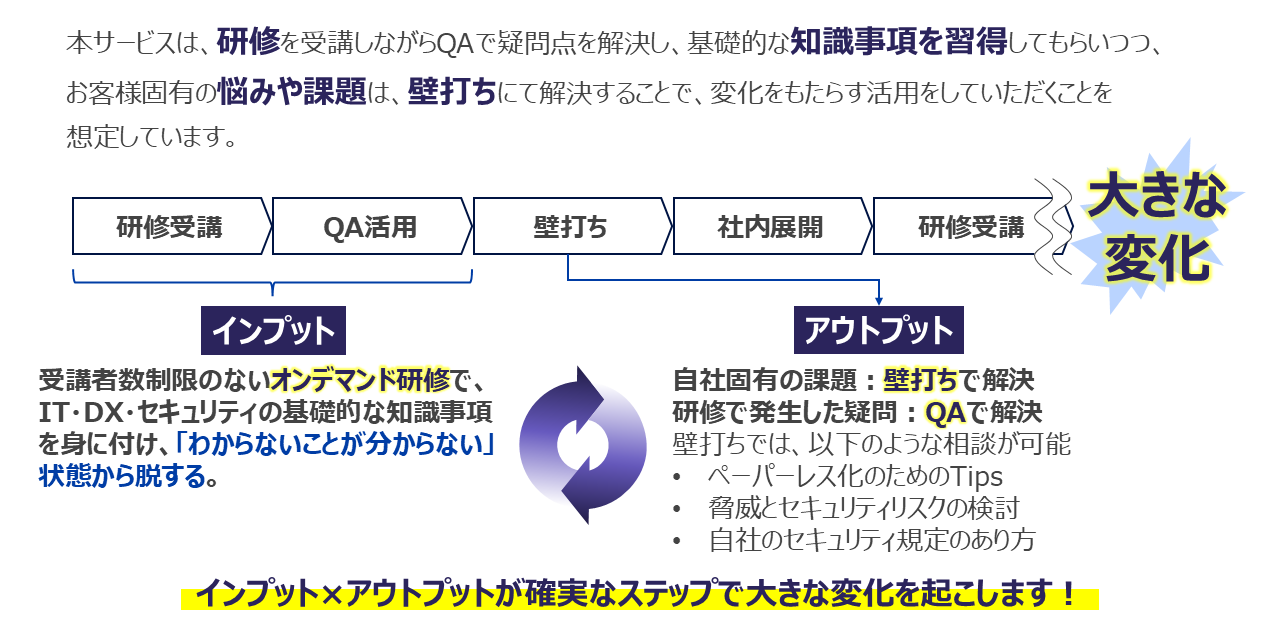 しかし現場では、DXと情報セキュリティを別々に学ぶことが多く、知識が断片化しやすいほか、研修が一度きりで終わってしまい定着しにくい、疑問が出ても相談先がないといった課題があります。研修投資を後押しする政策支援も進む中でも、体系的な教育と、実務に落とし込むための継続的な支援を両立することは容易ではありません。