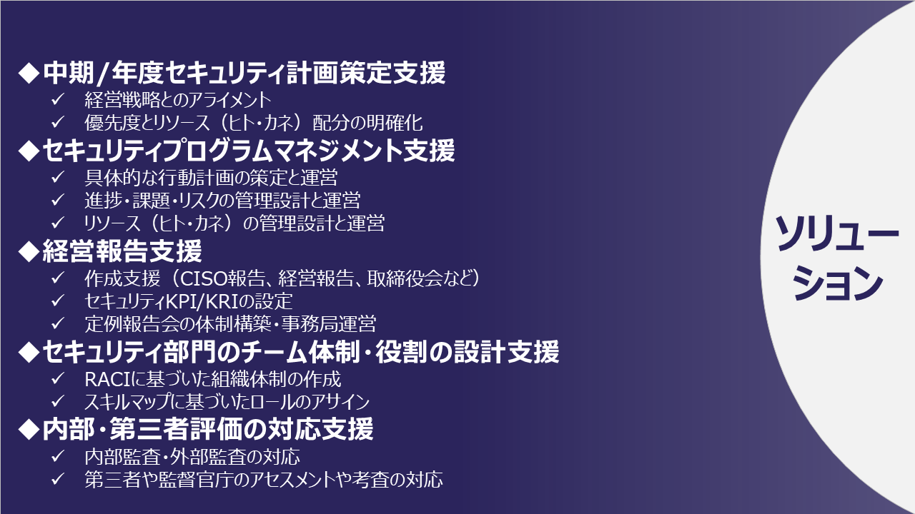 経営視点、実効力、運営定着力の提供により「経営層やセキュリティ組織が正しくリスクを認識し、リーダーシップによって適切な舵取りができる状態」を支援します。