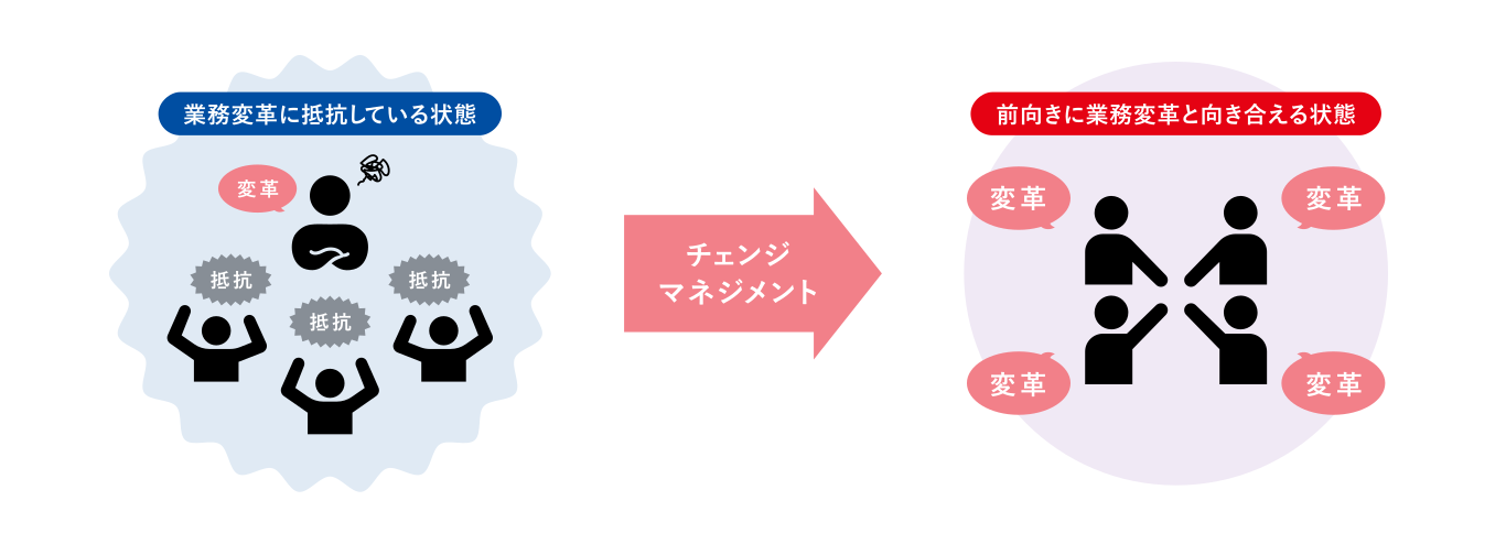 「業務変革」、「システム導入」など変革に対して抵抗感のある保守的なメンバーも巻き込みながら、組織全体が前向きに変革と向き合える仕組みづくりが、変革を成功させるためには重要です。