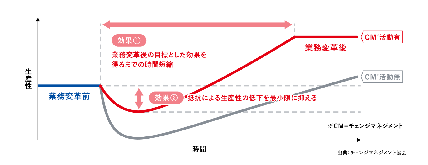チェンジマネジメントを行う事で、「業務変革後の目標とした効果を得るまでの時間短縮」、「抵抗による生産性の低下を最小限に抑える」という効果があります。