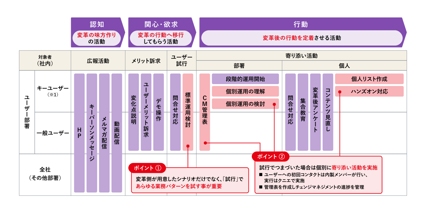 変革に対する行動へ移行してもらうため、メリットの説明や実際に変革後の業務を試してもらうと言った、訴求活動を行います