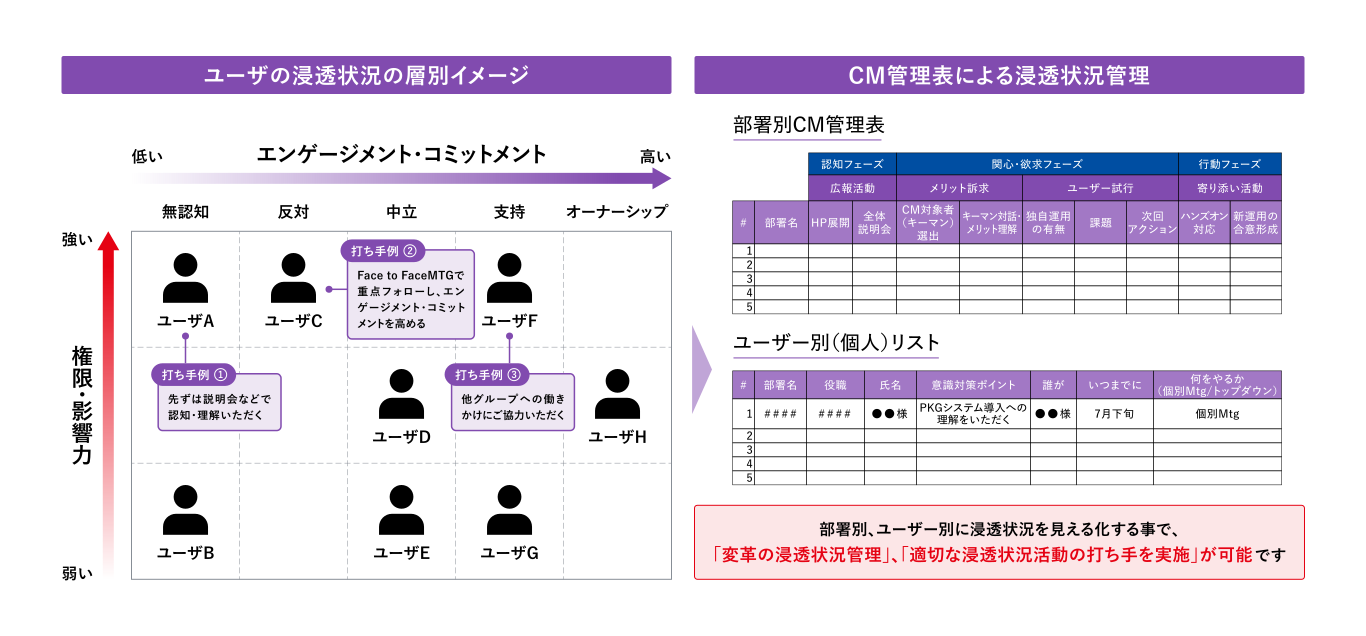 やみくもにチェンジマネジメント活動を行うのではなく、組織の中での影響力やエンゲージメント・コミットメントを加味しキーマンンを設定するなど、戦略的なチェンジマネジメントを実施します。具体的な実施内容はヒアリング等を行い、各企業に合った方法を設定いたします。