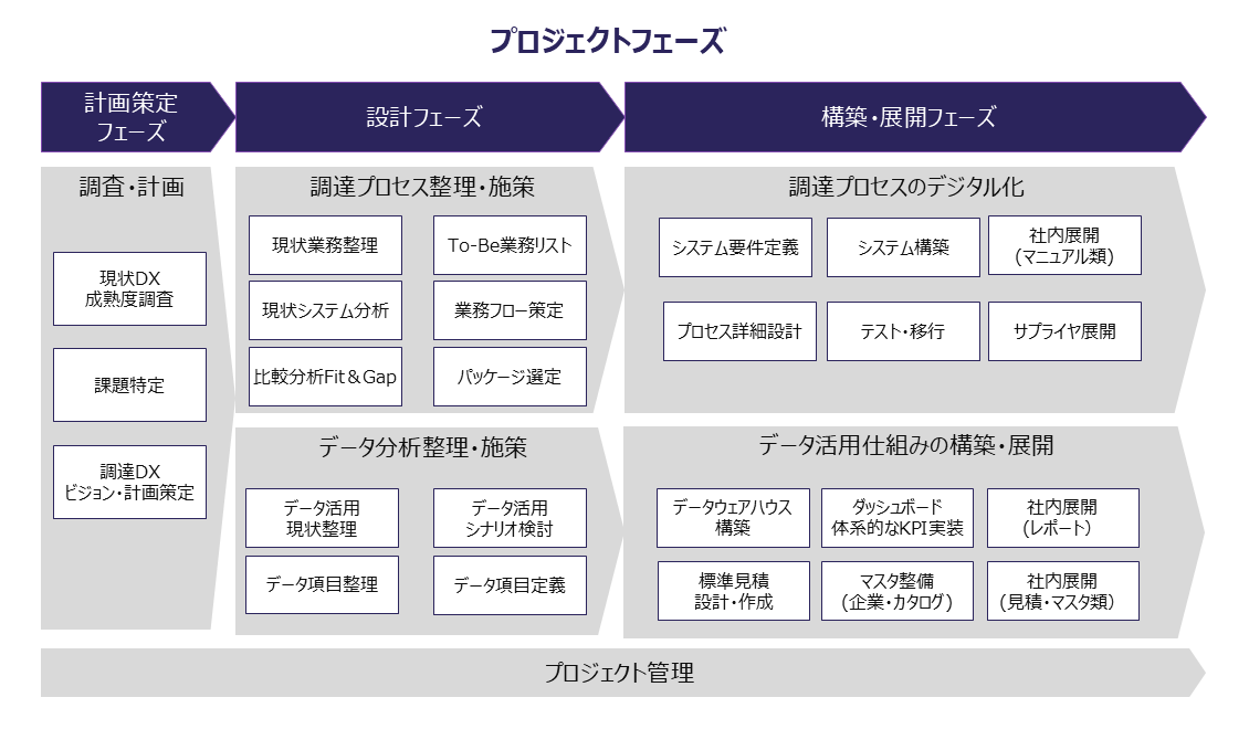 当社は、調達DXの構想策定から設計、システム構築・展開、そして現場への定着まで、プロジェクト全体を一貫してご支援します。現状業務やシステムの分析、To-Be業務の策定、パッケージ選定といった上流工程に加え、データ項目整理やマスタ整備、KPI設計、ダッシュボード構築まで幅広く対応。さらに、社内展開マニュアルやサプライヤ向け展開も含め、運用フェーズへの移行を見据えた支援を行います。当社の強みである業務改革・人材育成の視点から、お客様の持続的な変革を実現します。