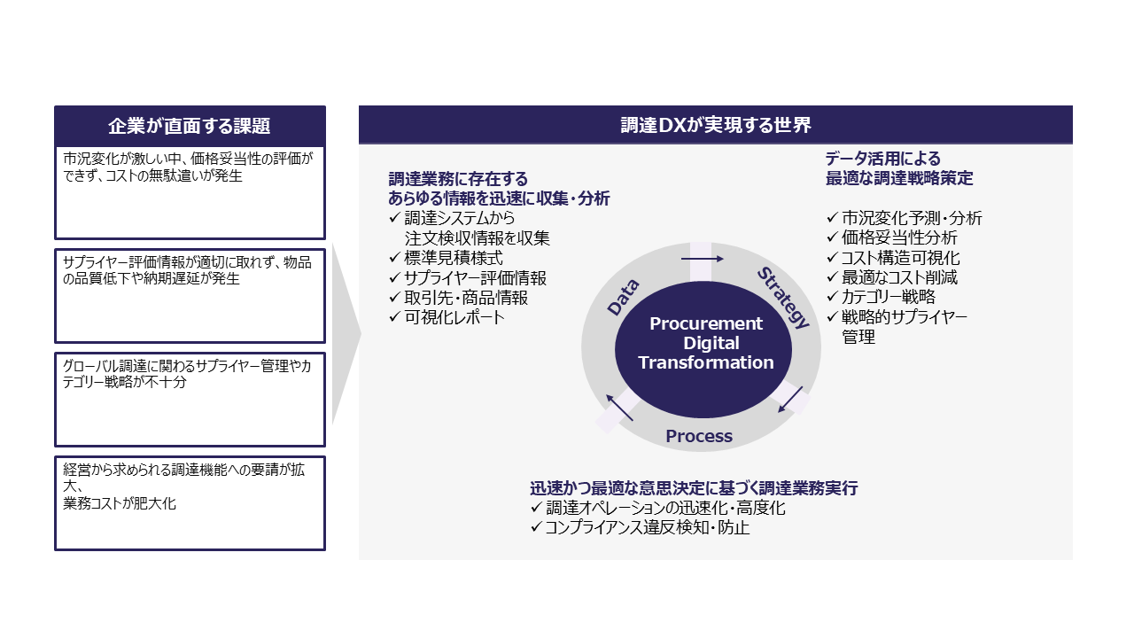 当社の「調達DX推進 ~データドリブン調達の実現~」では、調達業務に存在するあらゆる情報を迅速に収集・分析・可視化し、最適な調達戦略を策定するデータドリブンでの調達推進を支援します。具体的に調達システムからの注文・検収情報、標準見積様式、取引先情報などを統合し、市況分析やコスト構造の見える化、サプライヤー戦略の再構築を実現。データに基づく意思決定により、業務の高度化とコンプライアンス強化を図ります。