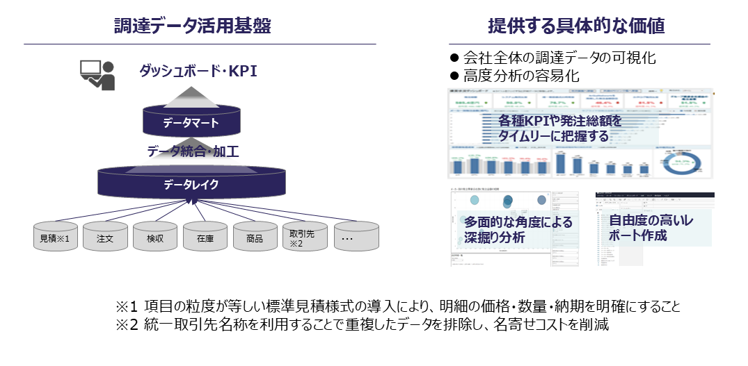 当社は、多くの企業に対し、調達データの活用分析手法の策定、調達データを有効活用できる基盤の構築を支援しています。データの統合・加工を行うデータレイクやデータマートの整備をはじめ、標準見積様式の導入、取引先情報の名寄せ、在庫・商品データの整備など、基礎データの整備から着手します。その上で、KPI設計やダッシュボードの構築を通じ、発注傾向などのタイムリーな把握や多角的な分析、自由度の高いレポート作成を実現します。これにより、調達業務の透明性と分析力が飛躍的に向上し、戦略的な意思決定が可能となります。