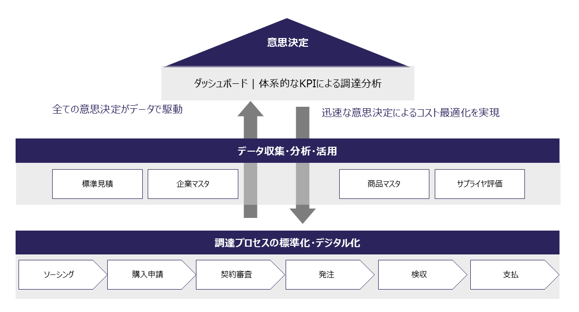 調達DXの実現には、調達プロセスの標準化とデジタル化を起点に、データを活用した意思決定の仕組みを段階的に構築していくことが重要です。まず、ソーシングから支払までの調達業務を標準化・システム化することで、見積明細、企業・商品マスタ、サプライヤー評価といった各種データが整備され、リアルタイムに収集・蓄積されます。次に、これらのデータをもとに分析・可視化を行い、ダッシュボードやKPIに基づく定量的な判断が可能となります。この仕組みにより、すべての意思決定がデータドリブンで行われ、迅速な対応とコスト最適化が同時に実現されるのです。当社は、このような調達DXの全体像を構想から実行まで一貫して支援します