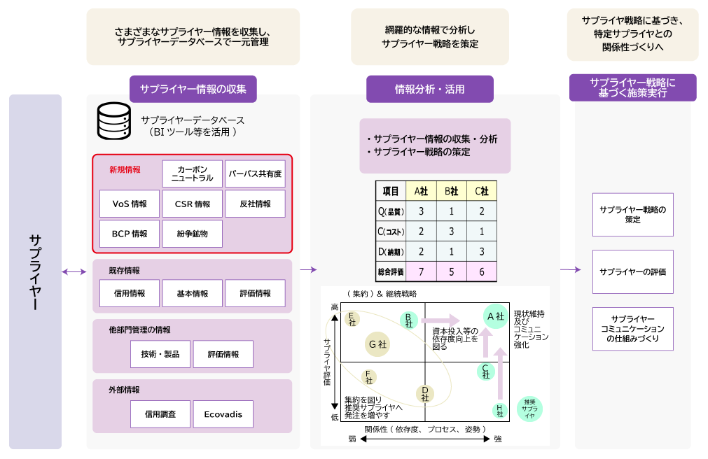 今まで収集していなかったサプライヤー関連情報の収集や、それらのサプライヤー情報を一元管理し、活用する仕組みを整えます。
