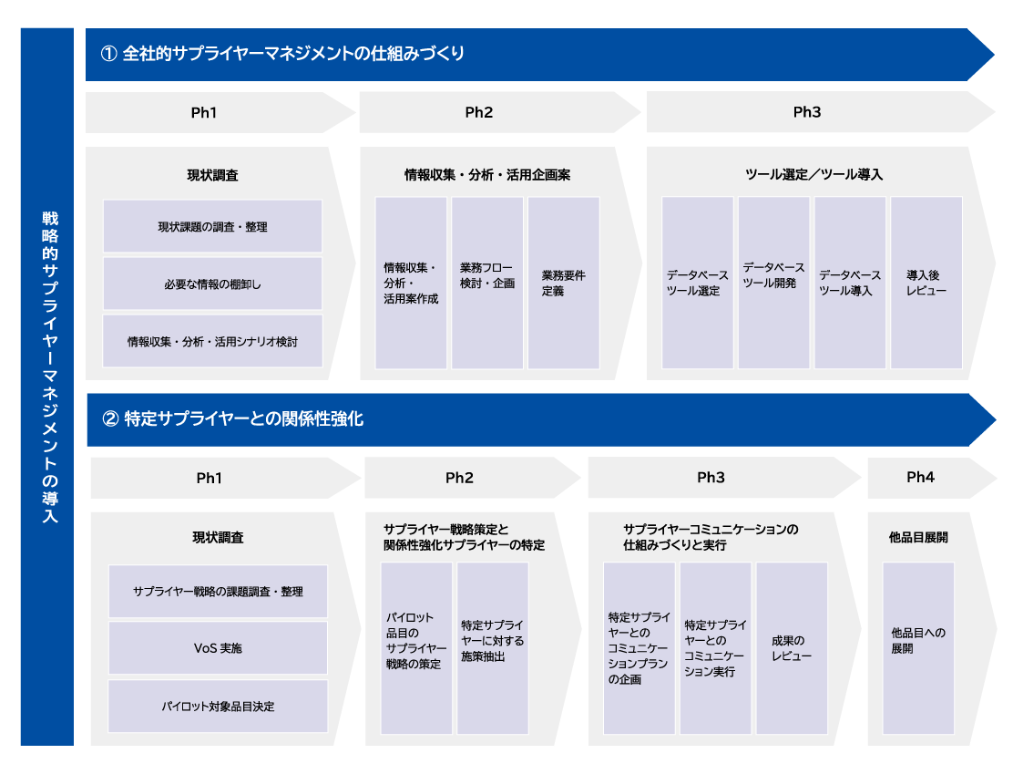 当社のコンサルティングアプローチは「全社的サプライヤーマネジメントの仕組みづくり」と「特定サプライヤーとの関係性強化」を並行で進めます。また、「特定サプライヤーとの関係性強化」については、「サプライチェーン全体のマネジメント強化」の視点から、VC構造やサプライチェーン構造を見える化し、必要に応じて関係性強化の対象を広げていきます。