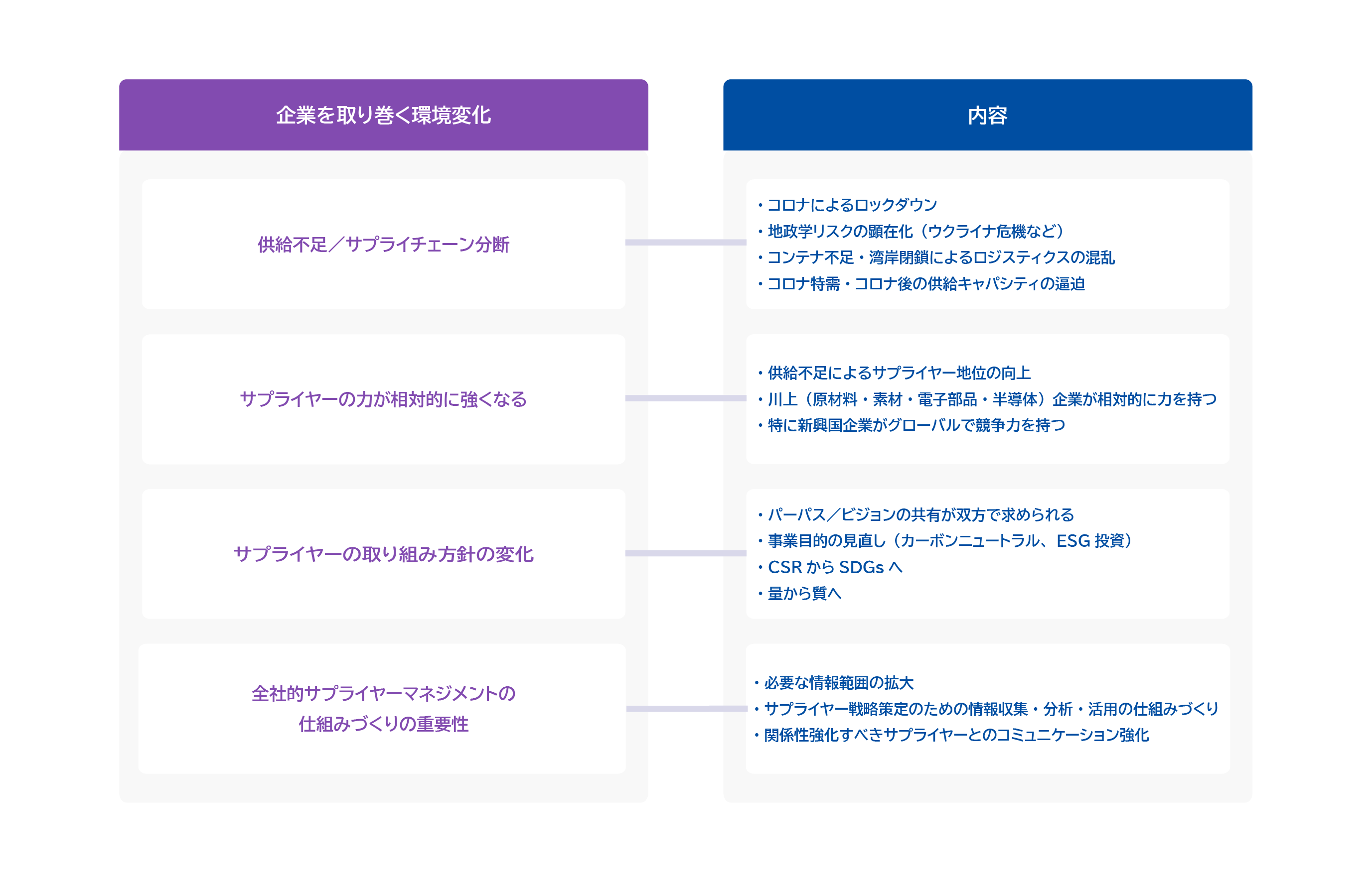 供給力不足や地政学リスクによるサプライチェーンの分断、サプライヤーとの力関係やサプライヤーの取り組み方針の変化、サプライチェーン全体でのサステナビリティ重視などの要因により、サプライヤーとの関係性づくりは全社的視点から進めていかなくてはならない状況にあります。