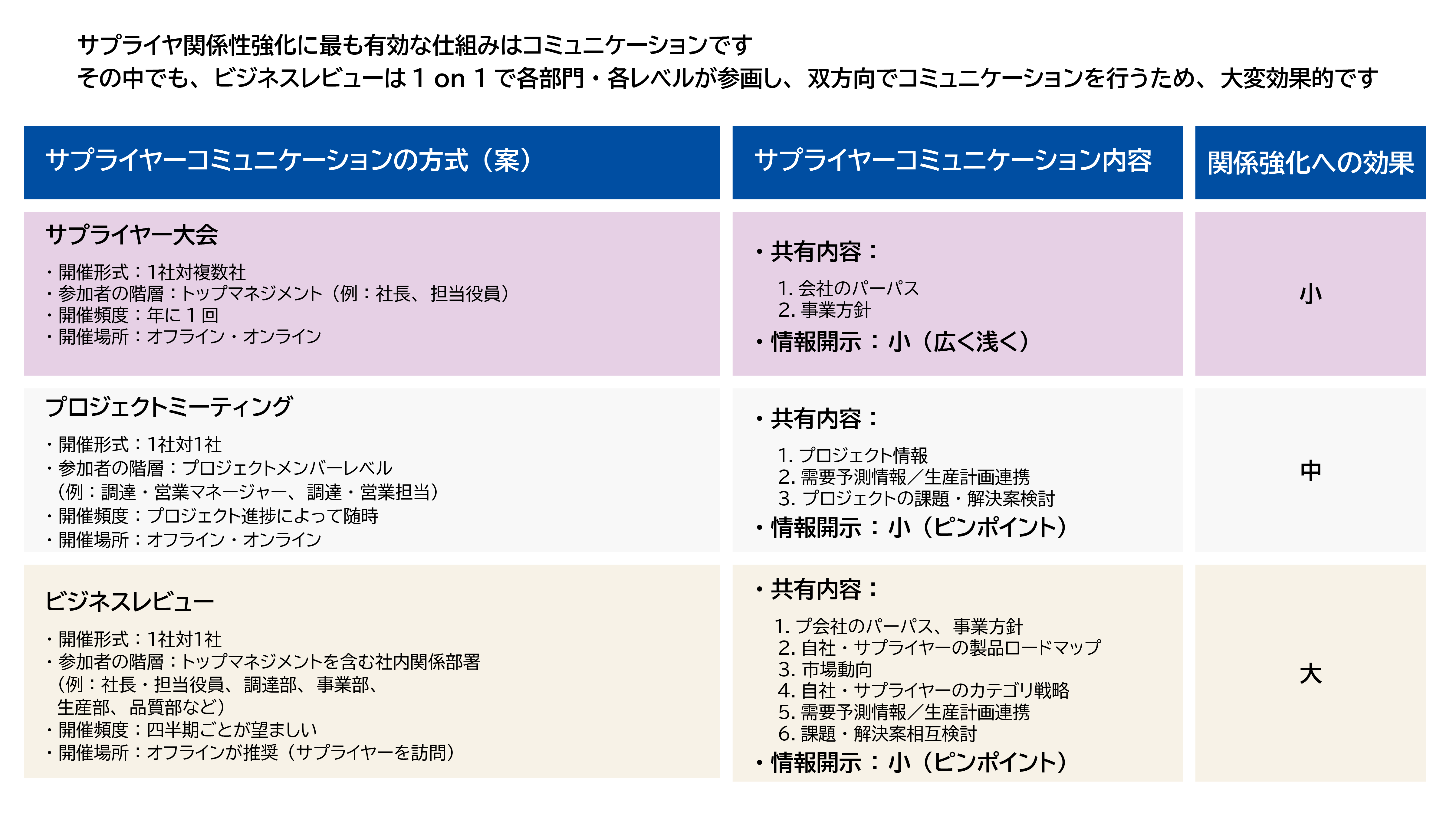 従来行っていなかった新たなコミュニケーション施策、たとえば1社対1社のビジネスレビューを実施するなどして真の関係性をつくり、サプライヤーとの両想いを実現することが、調達購買部門としての喫緊の課題です。