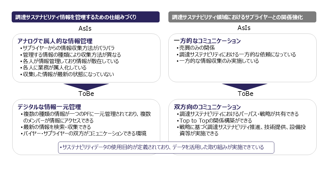 現状は、情報管理がアナログかつ属人的であり、サプライヤとのコミュニケーションが一方向的であるため、非効率かつサプライヤとのサステナブルな関係が構築できていないことが課題として挙げられます。今後は、サプライヤマネジメントプラットフォームを活用して情報を一元管理し、バイヤーとサプライヤが双方向でコミュニケーションを取りながら協力できる体制を構築することで、戦略的な関係強化を図ることが求められます。