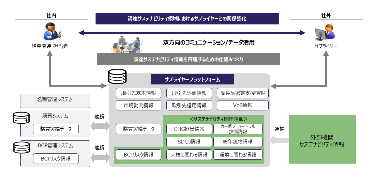 サプライヤマネジメントプラットフォームを導入し、GHG排出量、人権デューデリジェンス、BCPリスクなどのサステナビリティ情報を外部機関サステナビリティ情報と連携して統合・管理することで、データの可視化と戦略的活用を促進します。またサプライヤ企業とのパーパス・戦略を共有した上でプラットフォームを通じて双方向のコミュニケーションを取ることで、持続可能な調達戦略を実行することができます。