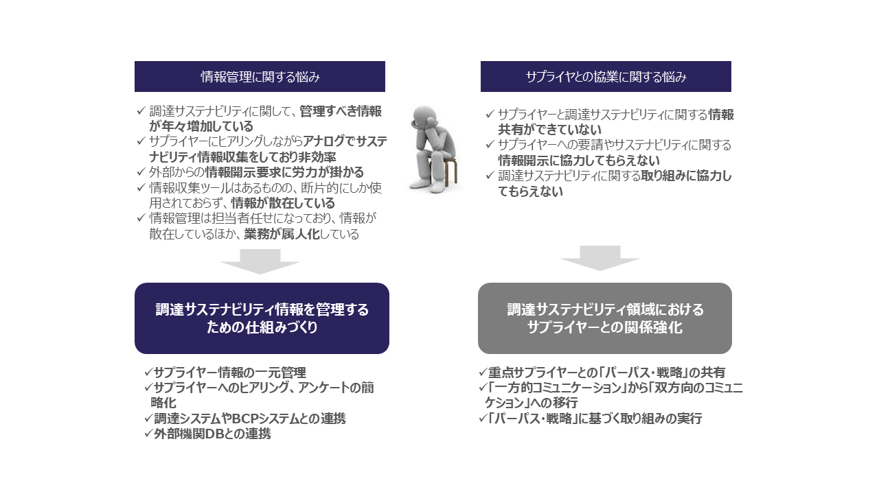 そのような状況下で調達部門では「情報管理に関する悩み」と「サプライヤとの協業に関する悩み」の2つの課題を抱えております。情報管理の課題としては、GHG排出量、人権デューデリジェンス、BCPリスク、環境情報など、多岐にわたるデータを適切且つ効率的に管理する必要があります。一方で、サプライヤとの協業においては、必要な情報を効率的に取得し、サステナブルな調達を実現するための関係強化が求められます。これらの課題に対応するため、調達部門は「調達サステナビリティ情報を管理するための仕組みづくり」と「調達サステナビリティ領域におけるサプライヤとの関係強化」の2つのアプローチを推進する必要があります。