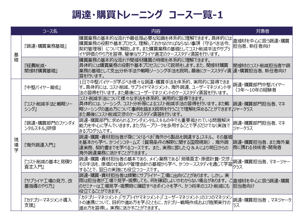 新人や異動者といったこれから調達購買業務を始める方のための「基礎研修」、調達購買業務を経験されている中堅バイヤーを対象とした「現場学研修」、調達購買業務の改革推進者のための「リーダー養成研修」をメニュー化しています。
