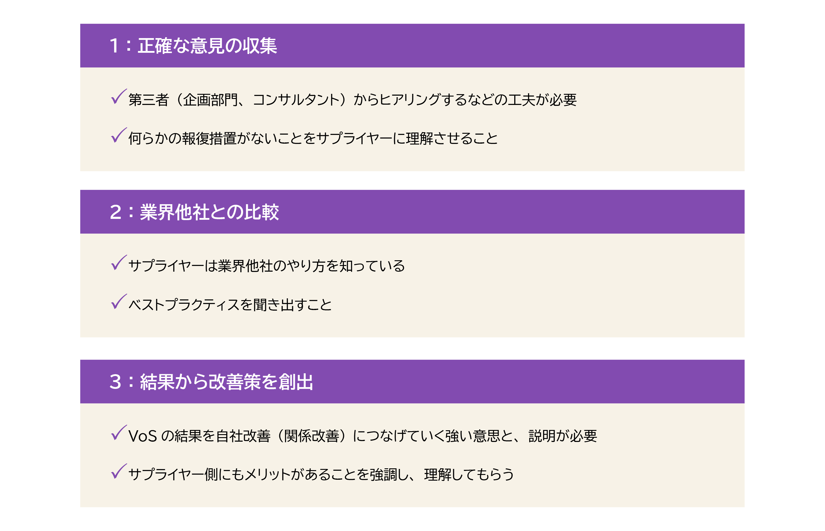 このようにサプライヤーの本音をヒアリングし、課題の解決や戦略策定を行うことが求められているのです。