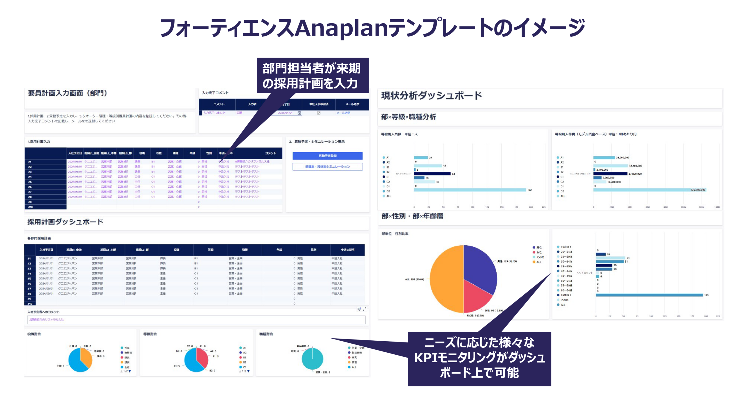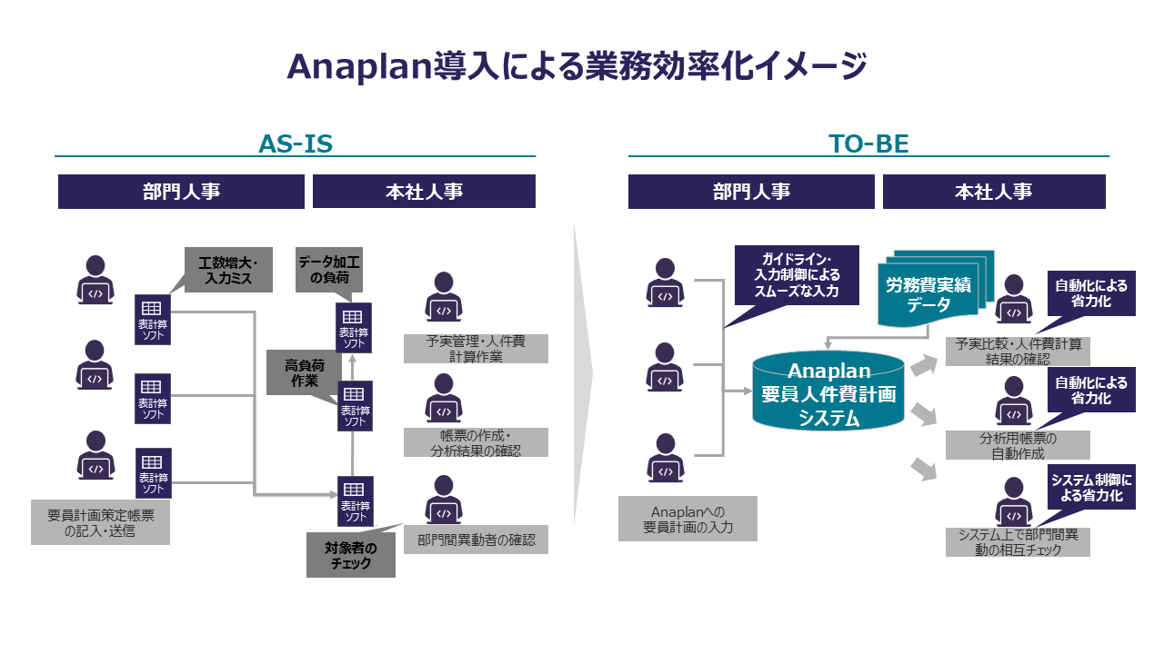 当該企業は、全国100を超える拠点から年に1回、次年度のバイネーム要員計画(個人ごとの異動計画と採用計画)をExcelで収集しており、本社人事で部門間異動者の確認・調整、経営報告用レポートの作成、その後の人件費シミュレーション等の業務に膨大な工数がかかっていました。このような状況の改善のため、全国の担当者が次年度の計画を入力し、システム上で部門間異動者の調整が可能な仕組みをAnaplanで構築することで、これまで本社人事が経営報告までにかけていた約1か月の期間を1週間に短縮し、スピーディーな経営判断に貢献しました。