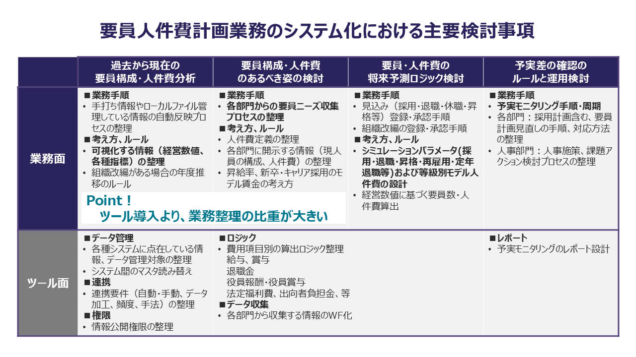 Excel中心の業務から脱却し、要員人件費計画業務を効率化させて経営からの期待に応えることが、これからの人事部門にとって非常に重要なミッションとなります。しかし、それは単に既存の業務をそのままAnaplan等のシステムに置き換えるだけでは達成できません。以下の「要員人件費計画業務のシステム化における主要検討事項」に記載の通り、システムの仕様以上に、貴社の要員人件費についての考え方やルールを再整理することが重要です。人事制度設計からIT運用支援まで幅広いケイパビリティを有する当社だからこそ、貴社にとって最適な要員人件費業務のあるべき姿を共に設計できます。