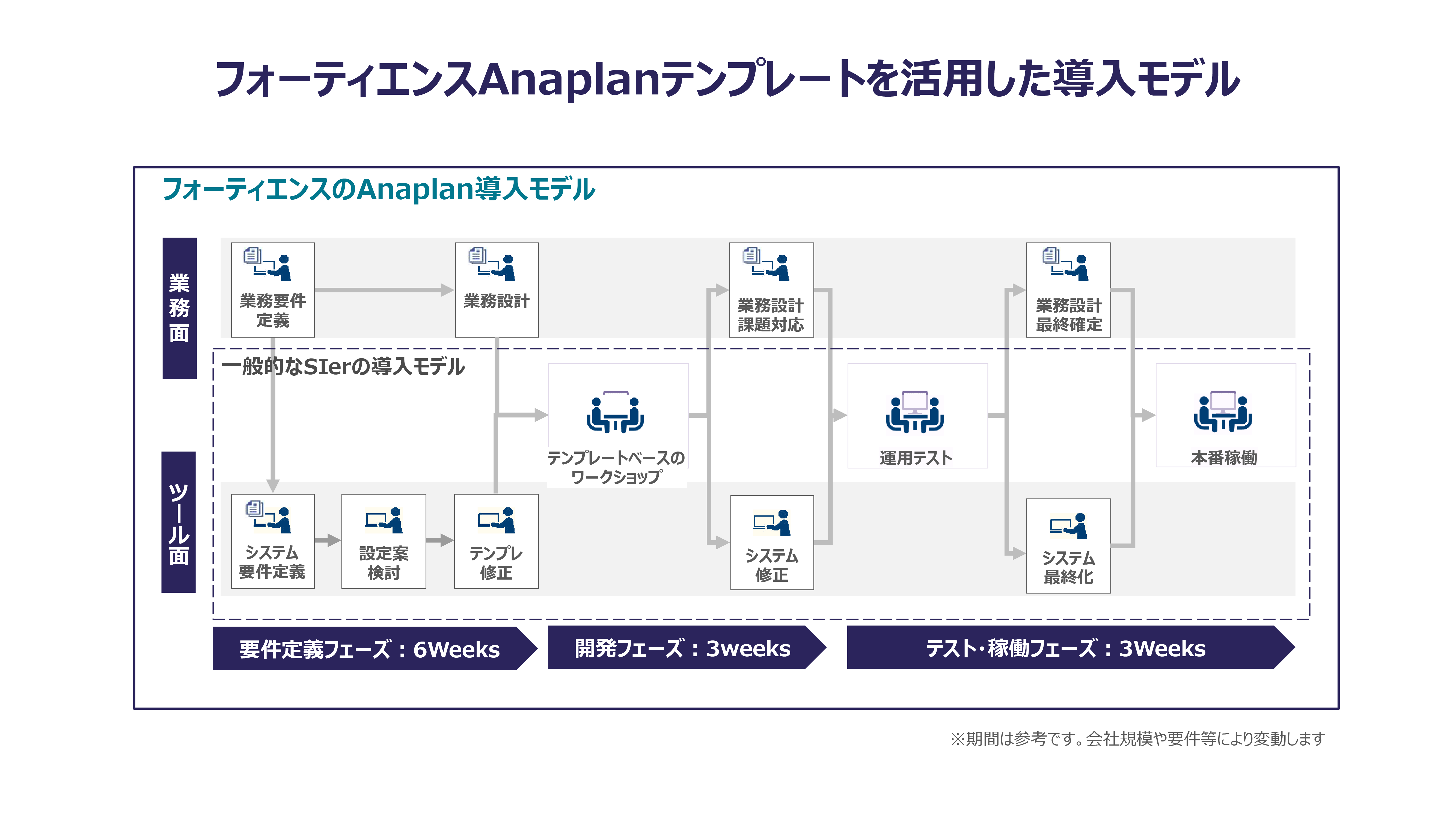これまでの要員人件費計画システム構築支援の経験をもとに、要員人件費計画業務のAnaplanテンプレートを作成しています。「Anaplanテンプレートを活用した導入モデル」のように、あらかじめ当社が作成した要員人件費計画のテンプレートを叩き台として貴社の新しい要員人件費計画業務をクイックに設計することが可能です。また、貴社の現在の業務をベースとして要件を整理し、オーダーメイド型のシステム化も可能です。
