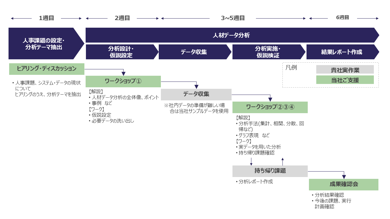 貴社の人事課題と実データを活用したカスタムメイドの実践的プログラムを設計します。人事業務とデータ分析に精通した当社のコンサルタントが丁寧にサポートし、分析設計から成果確認、改善施策の策定まで包括的に支援します。
