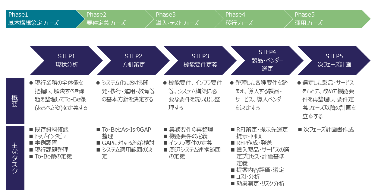 当社では基本構想フェーズをプロジェクトの命運を左右する非常に重要な局面と捉え、システム導入を成功に導くための第1ステップとして力強く支援いたします。