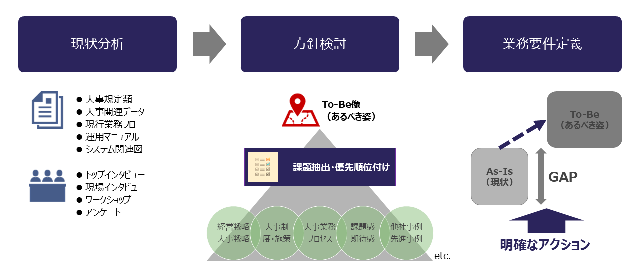プロジェクト成功に向けて、基本構想策定フェーズでは人事業務や人材の “To-Be像(あるべき姿)” を明確に定義すると共に、関係者間でシステム導入のゴールに向けた共通認識を持つことが重要となります。