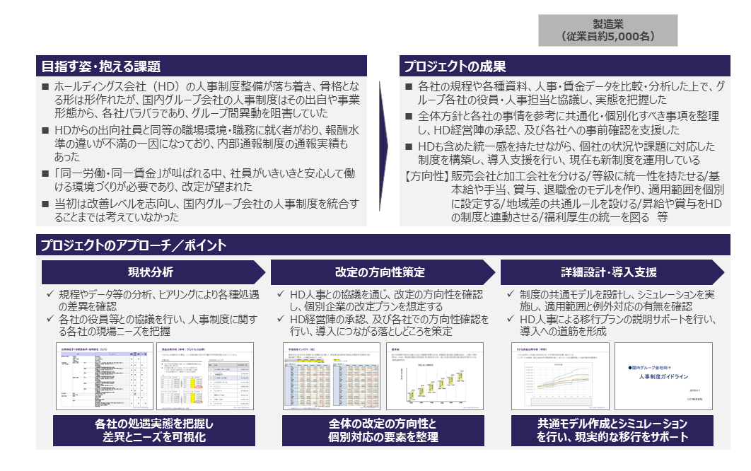 グループ統一の制度の共通モデル作成とシミュレーションを行い、現実的な移行をサポート